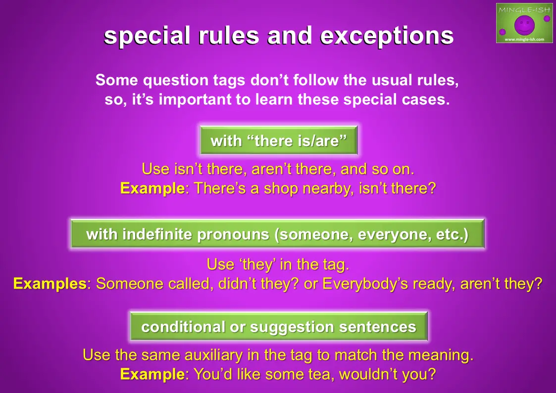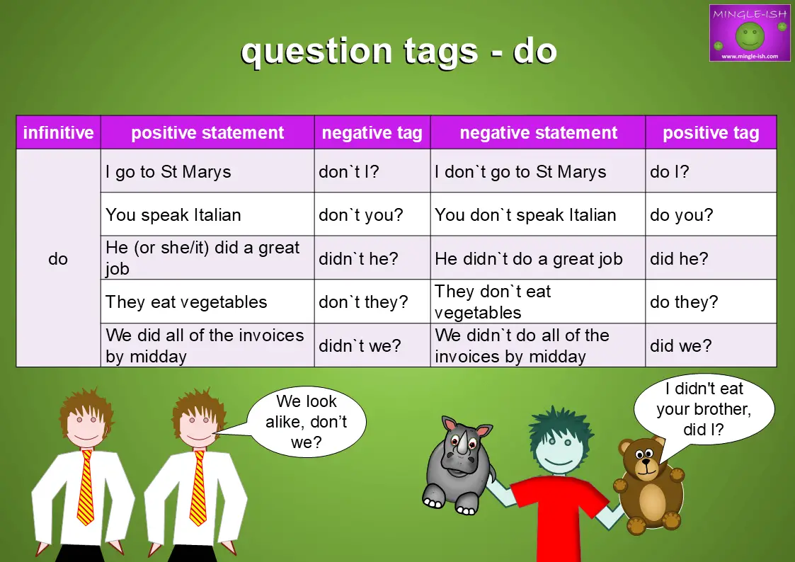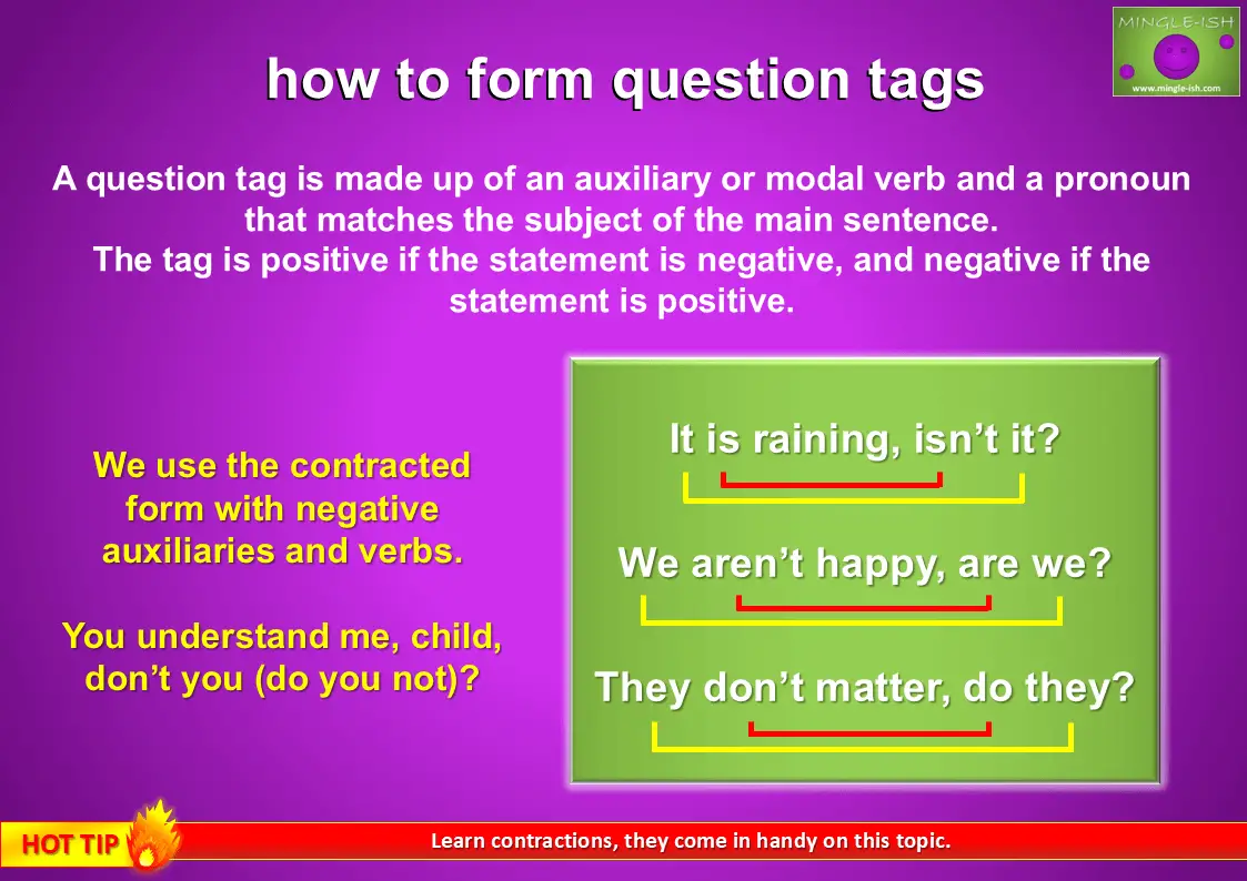 Forming question tags in English is simple once you know the pattern. A question tag is made up of an auxiliary or modal verb and a pronoun that matches the subject of the main sentence. The tag is positive if the statement is negative, and negative if the statement is positive.