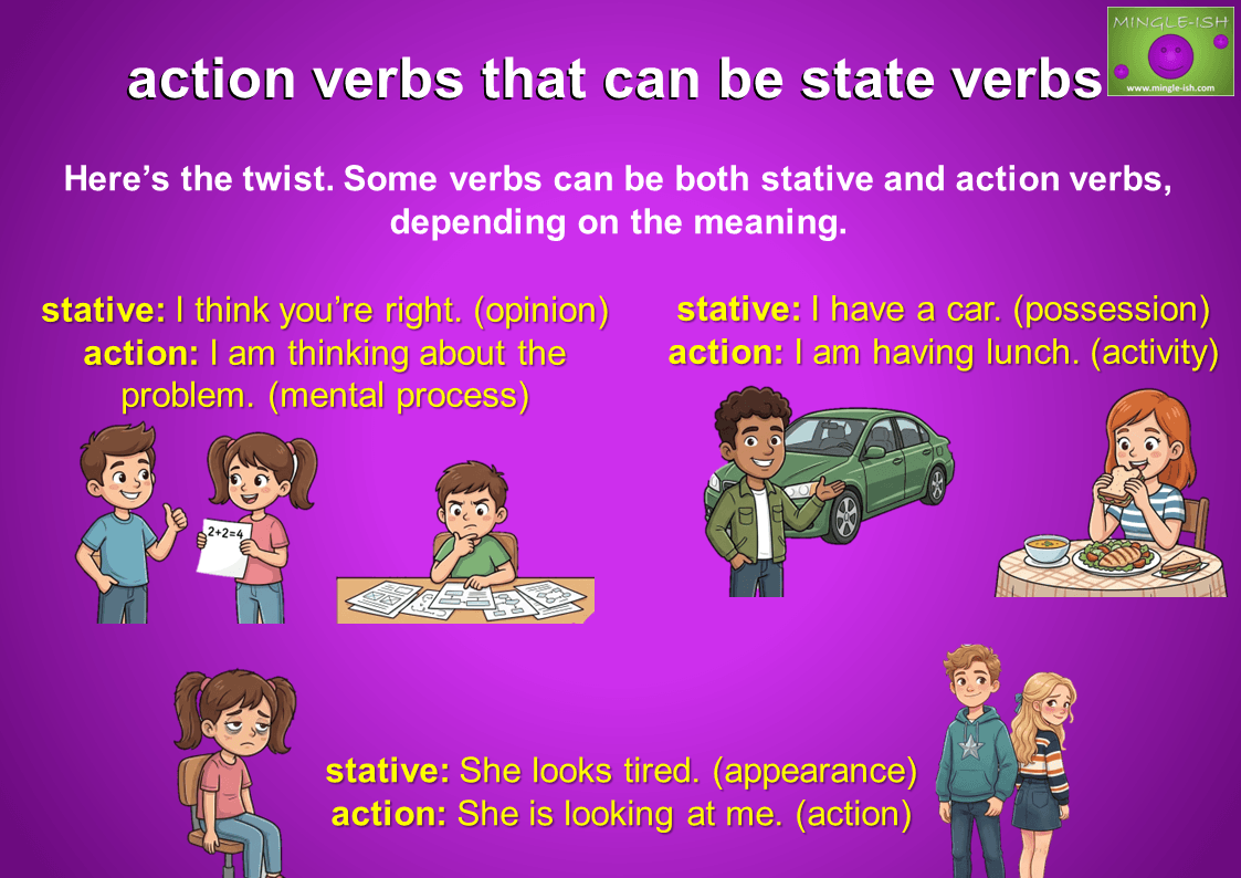 But wait… some verbs are sneaky. Here’s the twist. Some verbs can be both stative and action verbs, depending on the meaning.