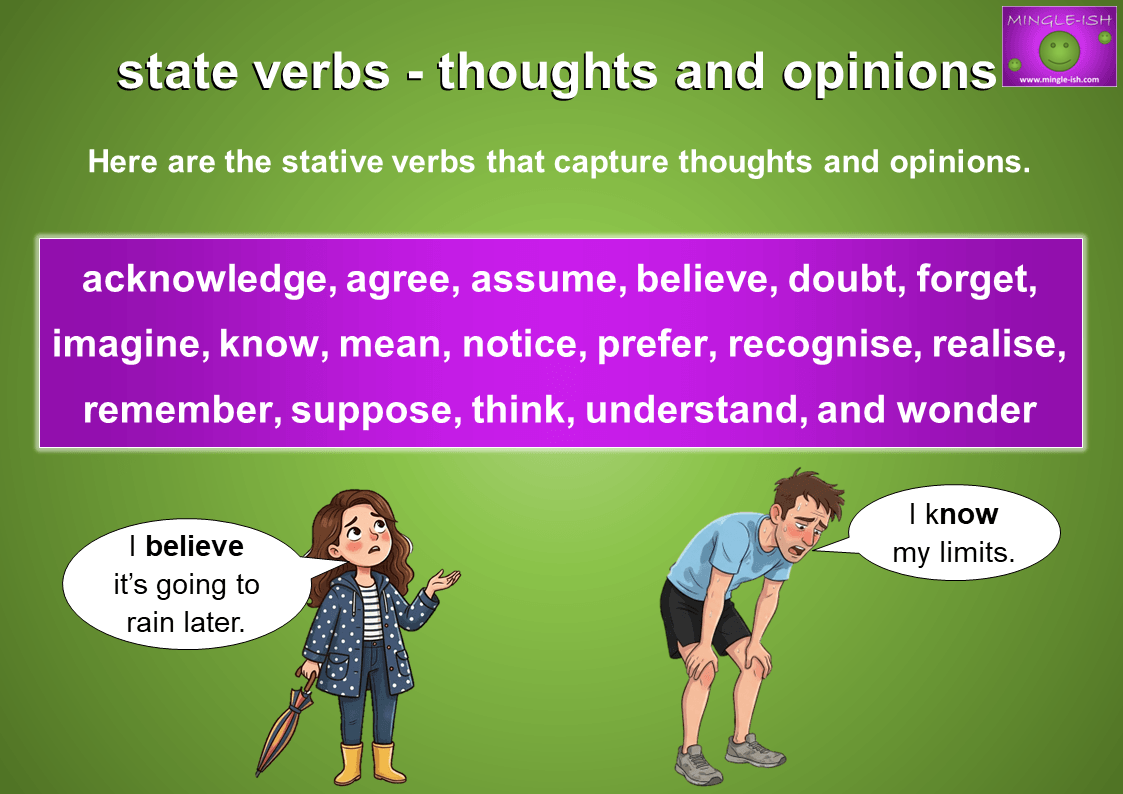 Here is the list of mental state verbs, used as stative verbs with real-life examples to show how they describe a condition of the mind: