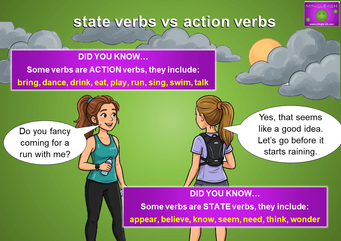 Stative verbs describe conditions or states. Action verbs describe things you can actually do. If it feels like movement or activity, it’s probably an action verb. If it feels like “just existing”, it’s likely stative.