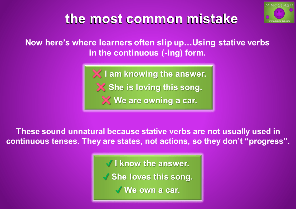 Now here’s where learners often slip up…Using stative verbs in the continuous (-ing) form.