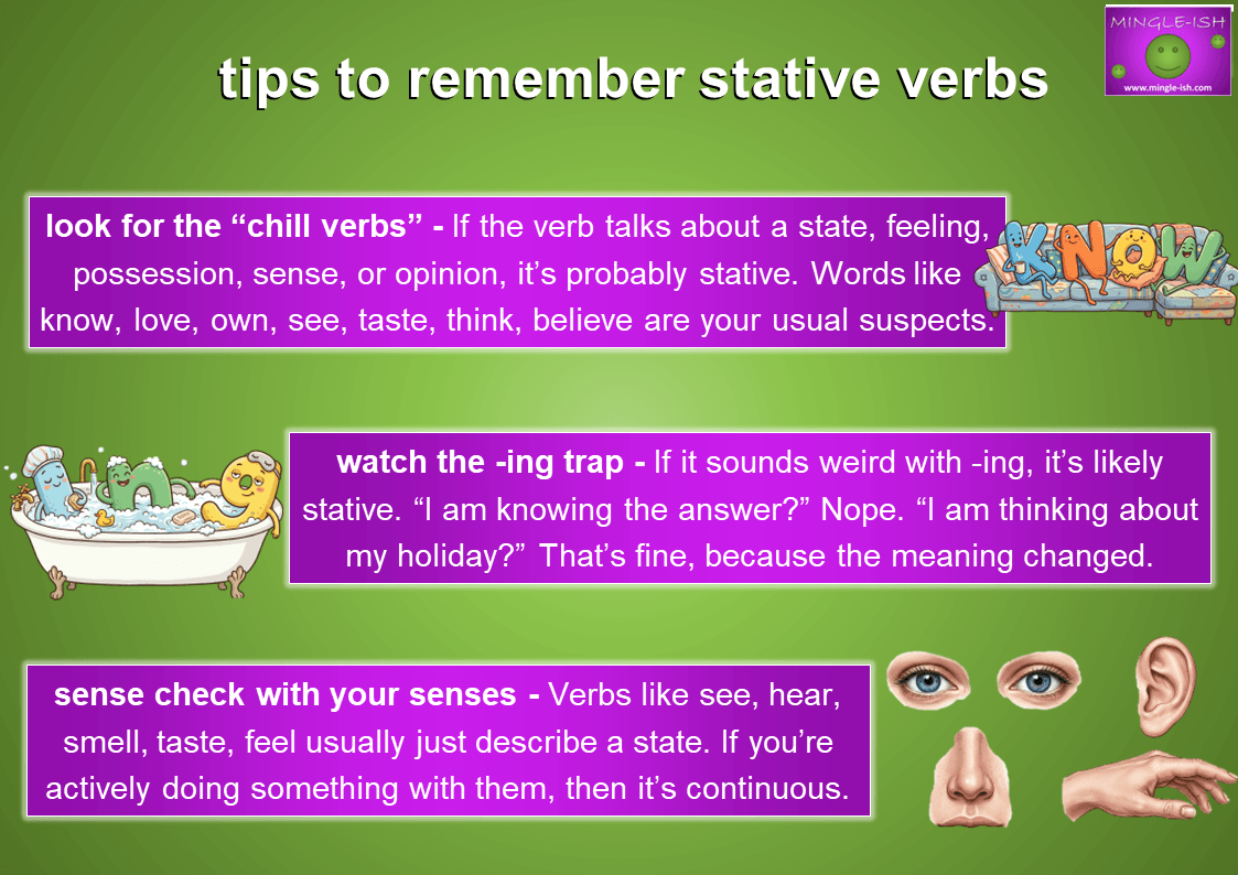 Stative verbs can be sneaky little things, but don’t worry – you can totally tame them with a few easy tricks. Here’s how to spot them without scratching your head:
