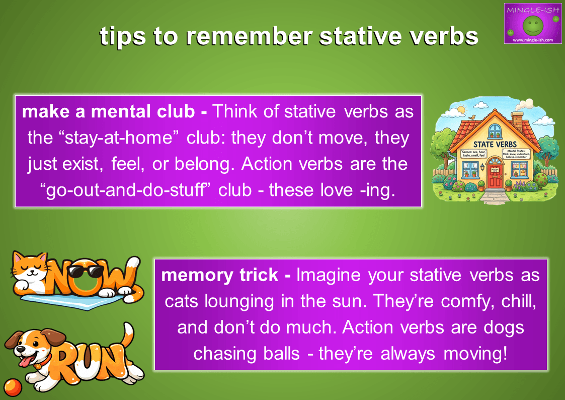 Memory trick – Imagine your stative verbs as cats lounging in the sun. They’re comfy, chill, and don’t do much. Action verbs are dogs chasing balls – they’re always moving!