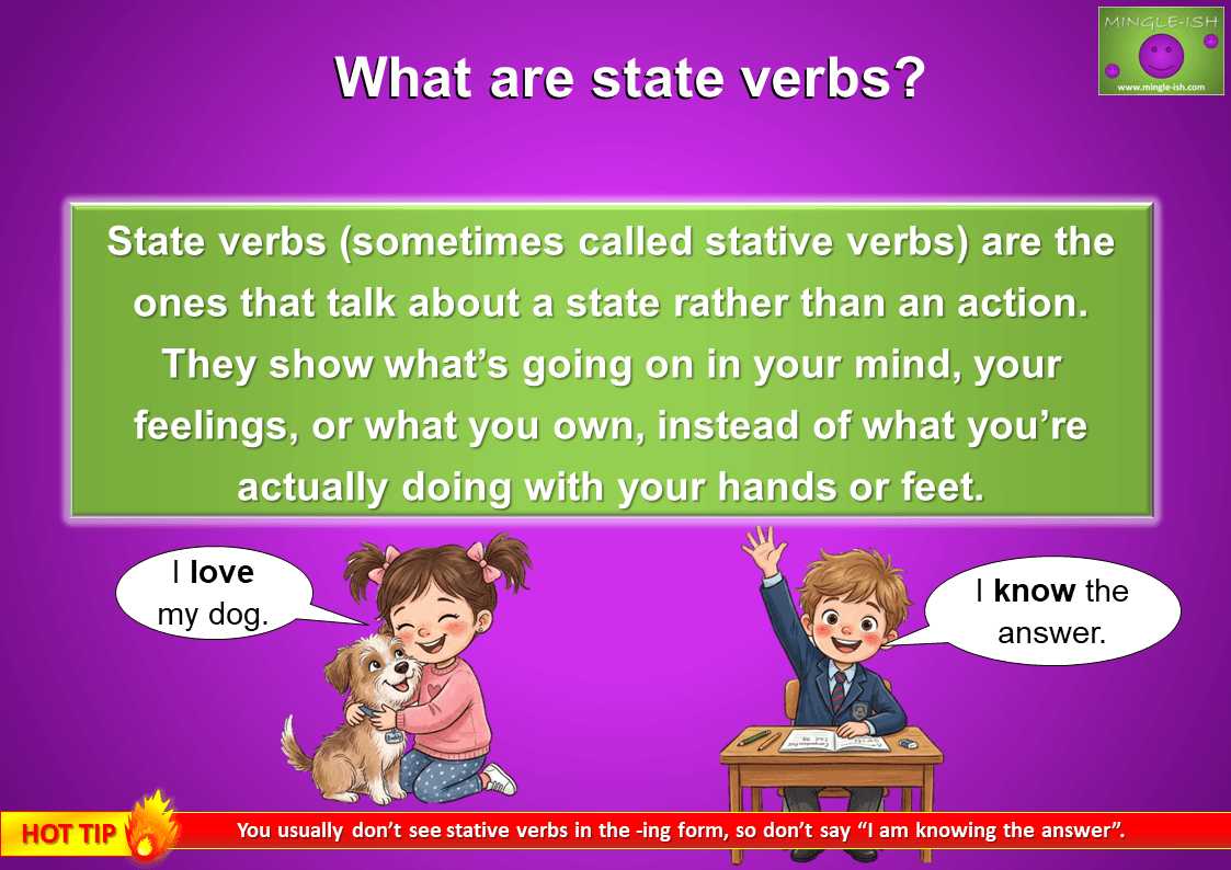 State verbs (sometimes called stative verbs) are the ones that talk about a state rather than an action. They show what’s going on in your mind, your feelings, or what you own, instead of what you’re actually doing with your hands or feet. Think of verbs like love, know, believe, have, seem – you can’t really “do” them like you can “run” or “jump.”