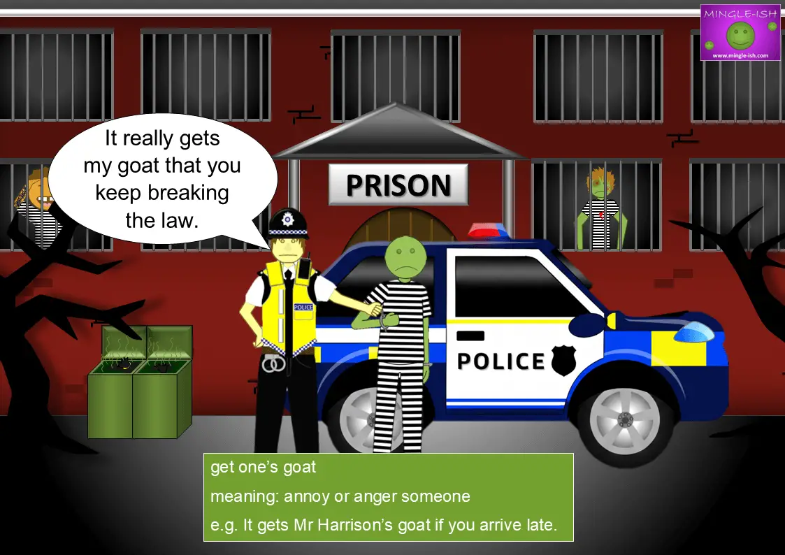 e.g. I need to score today. If I can get one up on Cody, Laura will go out with me. - get one’s goat annoy or anger someone