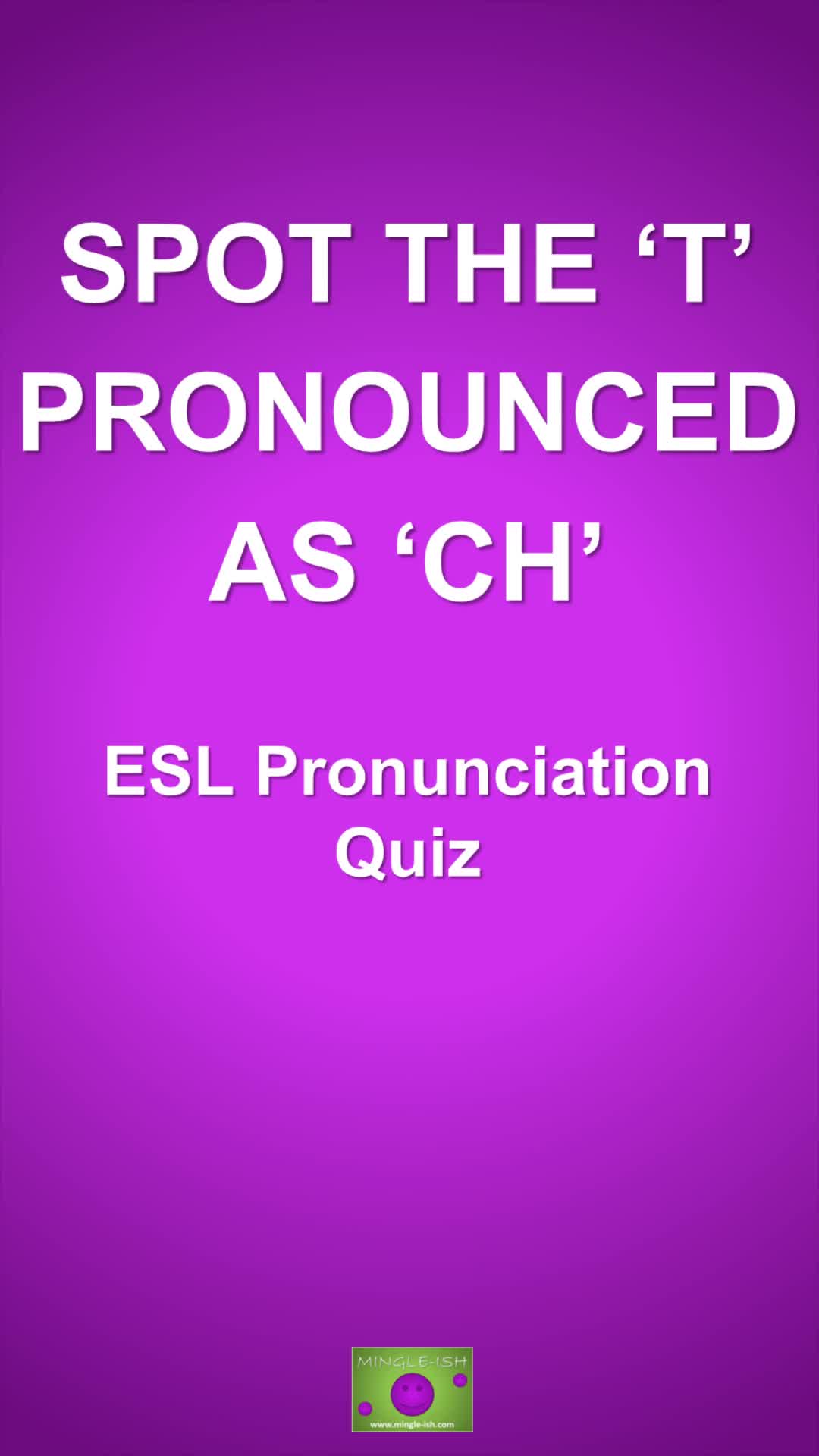 Can you hear the difference? In this quick ESL pronunciation quiz, test your listening skills and spot when the letter ‘t’ is pronounced as ‘ch’. Perfect for EFL and ESL learners who want to sound more natural and fluent in English. Take the quiz and see how many you get right — let’s go! #eslquiz #efllearning #englishpronunciation #pronunciationpractice #learnenglish https://mingle-ish.com/pronunciation-tips/pronouncing-the-t-as-a-ch/