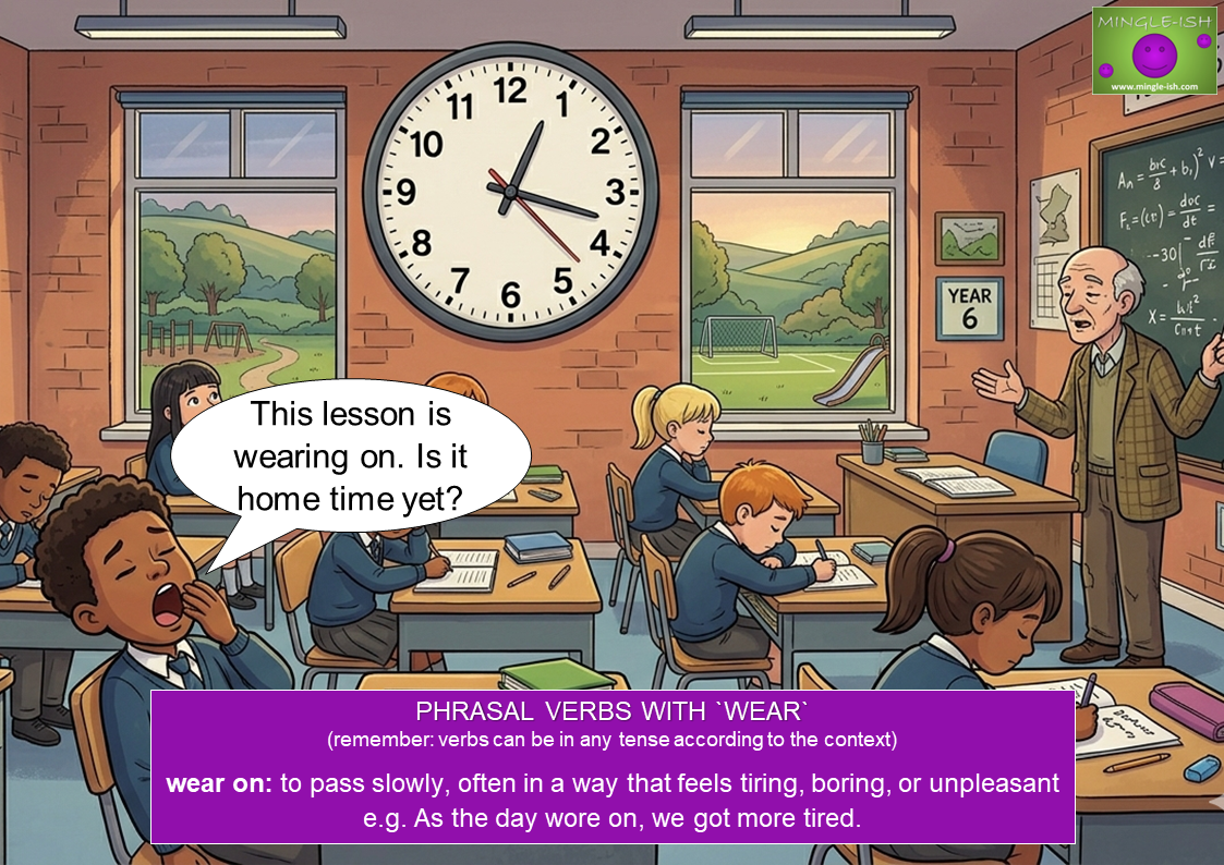 Hot Tip: Think of wear verbs like your clothes and energy: wear out = you after a long day, totally knackered, “I’m worn out,” wear off = perfume or magic fading, disappearing over time, “The smell wore off,” wear through = socks with holes at the toes, damaged until it’s gone, “I wore through my shoes.” Picture it, say it, use it – and these sneaky little verbs will stick better than gum under a school desk.