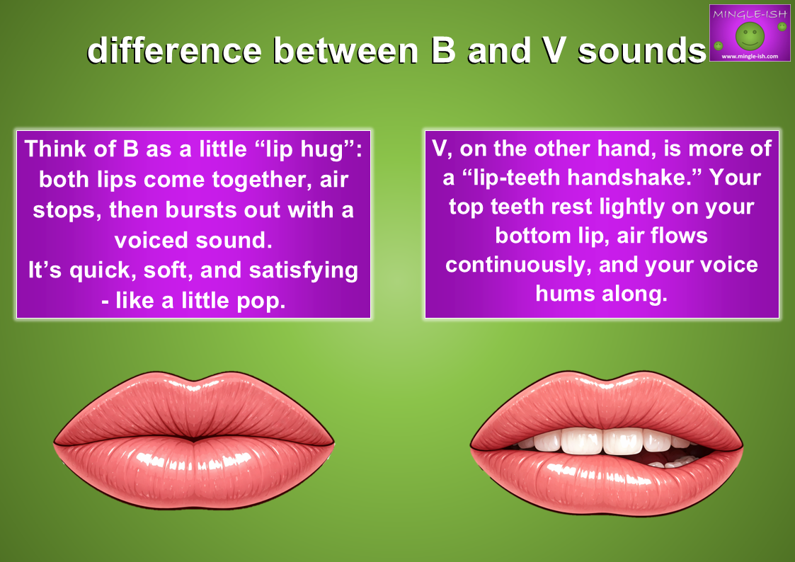 B and V might look like tiny letters, but in your mouth, they’re doing very different things. Think of B as a little “lip hug”: both lips come together, air stops, then bursts out with a voiced sound. It’s quick, soft, and satisfying – like a little pop.