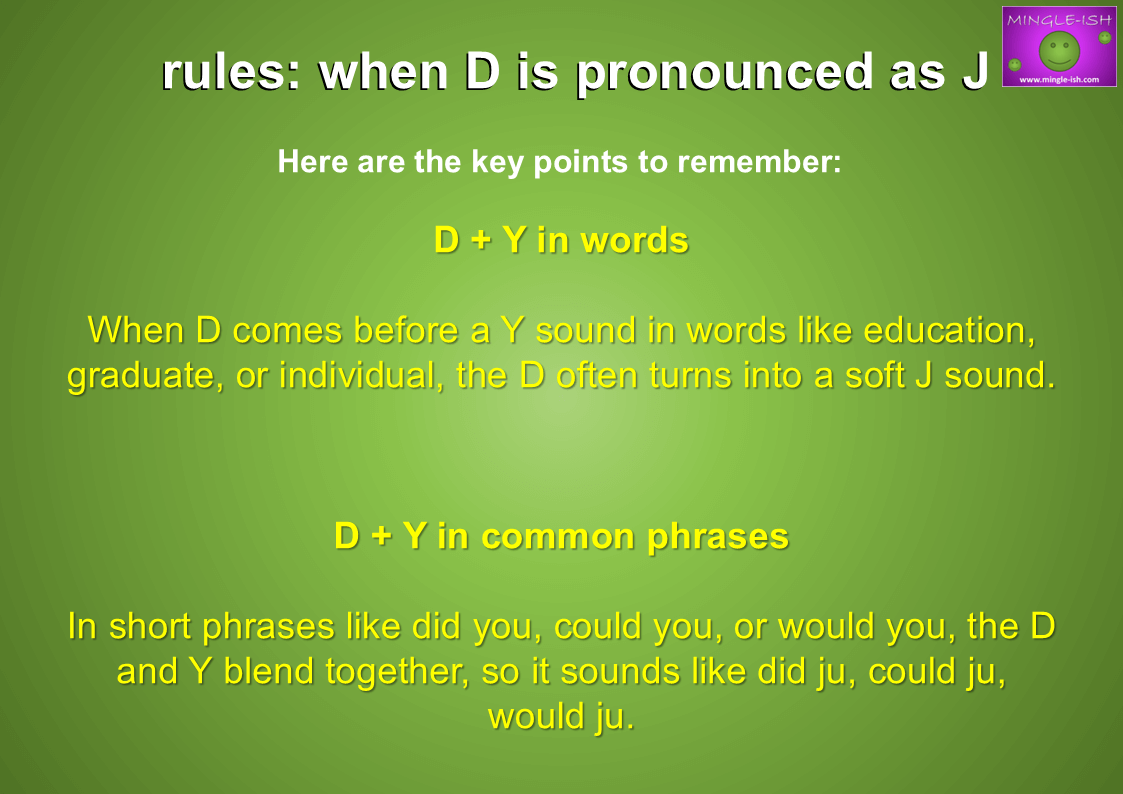 - D + Y in words – When D comes before a Y sound in words like education, graduate, or individual, the D often turns into a soft J sound.