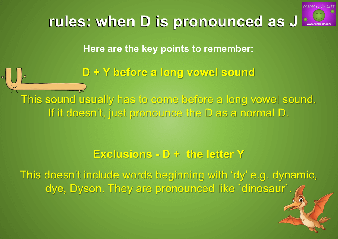 - Exclusions – D + the letter Y – This doesn’t include words beginning with ‘dy’ e.g. dynamic, dye, Dyson. They are pronounced like `dinosaur`.