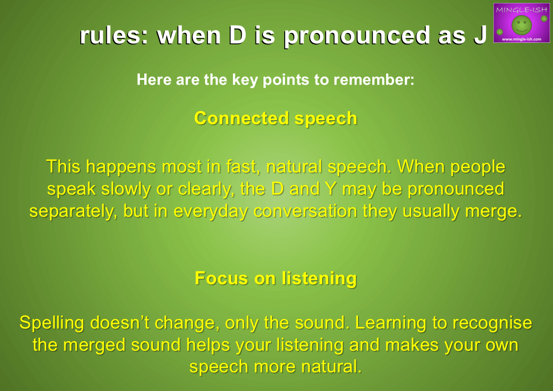 - Connected speech – This happens most in fast, natural speech. When people speak slowly or clearly, the D and Y may be pronounced separately, but in everyday conversation they usually merge.